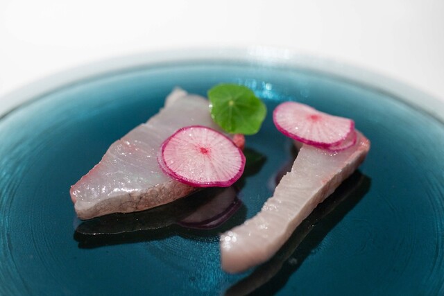 04.会瀬漁港大内商店カンパチ藁焼き 冬瓜(発酵、火入れ、生の3通り)と山茗荷のソース