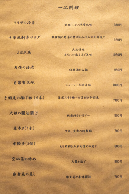 定番になっている紹興酒漬け、よだれ鶏、焼き物が非凡(何度も食べているので感想は省略)。