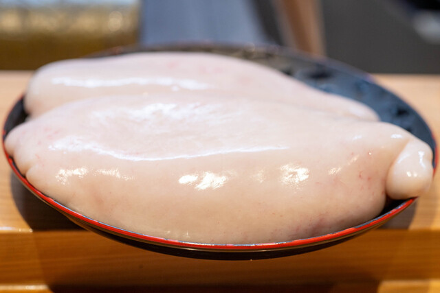 05.いわき梅田水産沼之内産メスの天然トラフグ湯引き 昆布で炊いてから裏漉した白子とポン酢