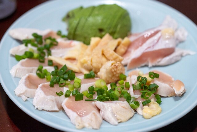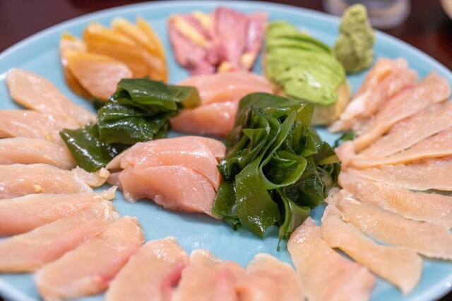 01.比内地鶏の盛り合わせ(もも肉、むね肉、ささみ、アボカド、わかめ、自家製カラスミ)
