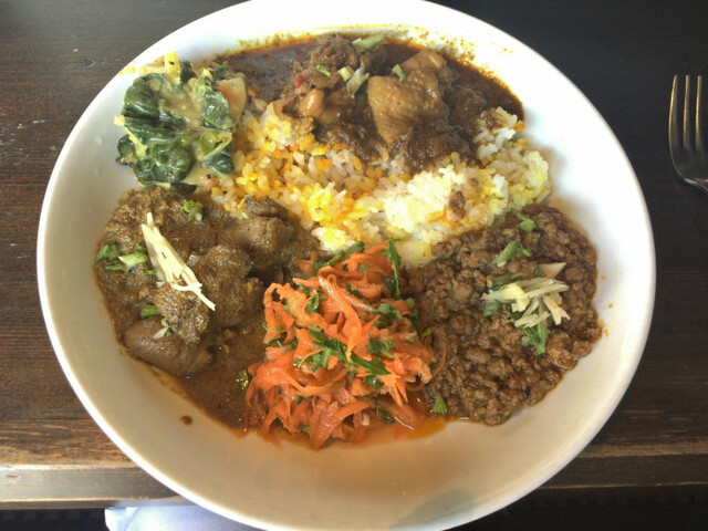 カレーの仕切りになっている副菜2種もちょっと気が効いた感じでカレーにぴったり。ご飯はジャポニカ米なんだけど色がついていて、スパイスも一緒に炊き込んでいるらしい(ターメリック、クミン、カルダモン、シナモン、塩、レッドペッパー、ベイリーフ)