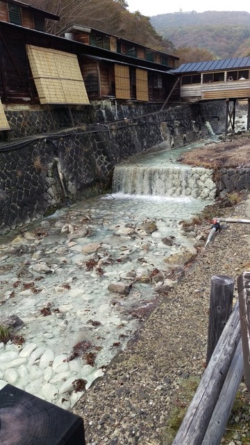 硫黄は臭すぎず、白い温泉。比較的高温で男風呂は4人は入れる浴槽が6つ。