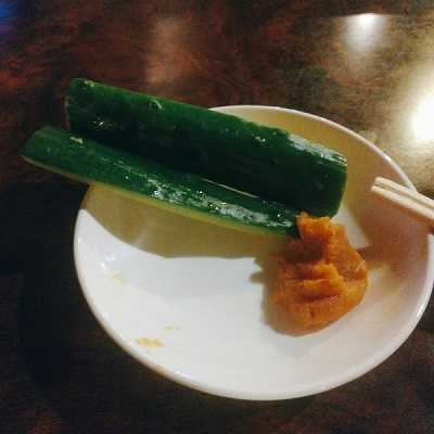 焼酎のお湯割りをいただき、お通しのキュウリに味噌をつけて。