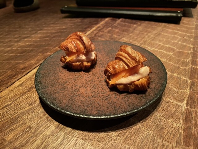 お通しがイタリアン風の味付けのアスパラガス・クロワッサンサンド