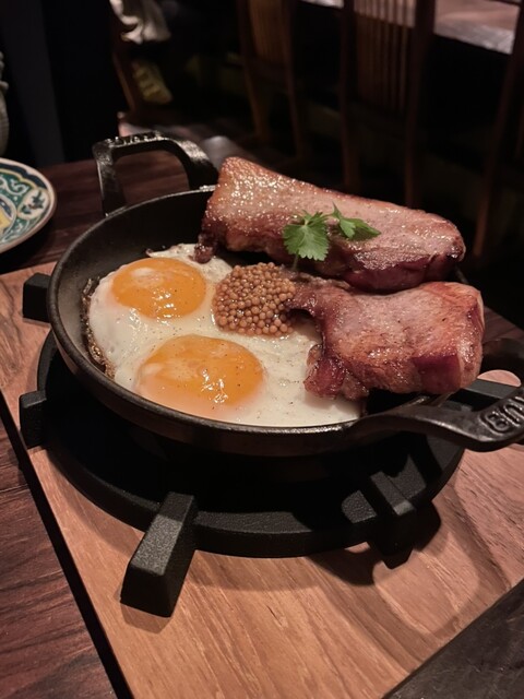 宮崎駿映画「ハウルの動く城」イメージのベーコンエッグ。ベーコンが分厚くて旨味たっぷり。粒マスタードがアクセント。