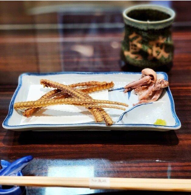 待っている間に、自分のうな重の鰻の“骨せんべい”と新鮮な“肝わさ”が提供されます