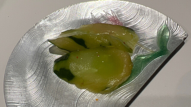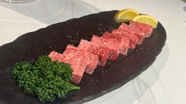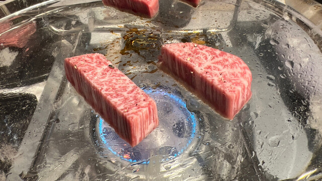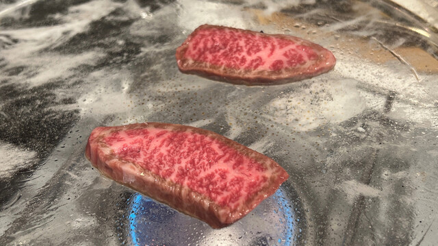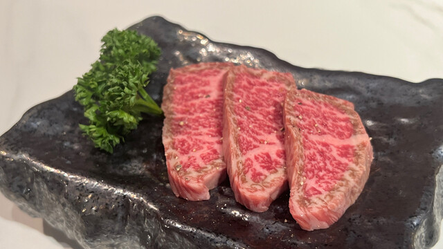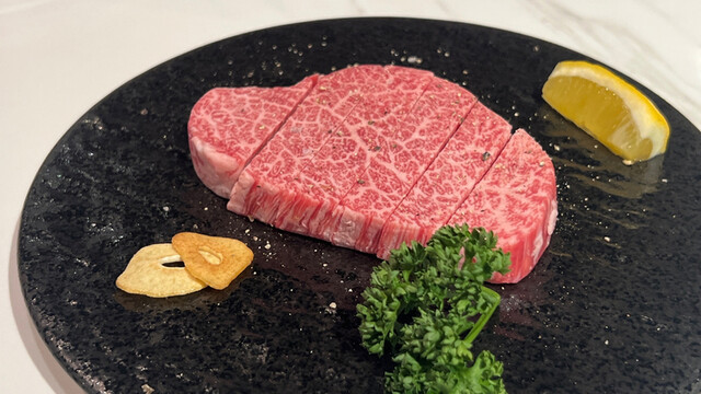 メニューのコースは2種類。7700円(税込)と9800円(税込)。違いはというと、前者はヘレと特選赤身での二種盛、後者はこれにサーロインを合わせての三種盛でいずれもお肉はトータル200gとの事。