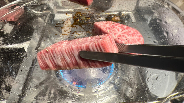 なんでも水晶プレートで焼くと美味しく綺麗に焼けるらしい。あ、ココは自分で焼く店ね(^_-)