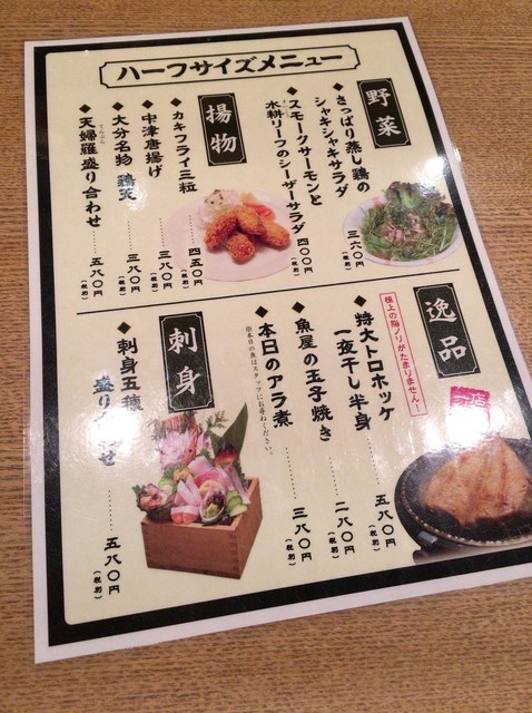 席についてメニューを見ると、刺身の盛合せ種類がたくさん。