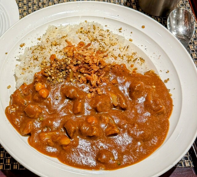 ビーフカレーにはひよこ豆とフォンドボーで味が染み込んだビーフ、ご飯にはスパイスがかかっている素晴らしい一品。