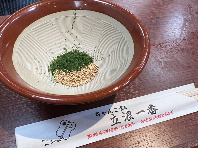 青のりと胡麻をすってそこにスープを合わせて最高の味に。