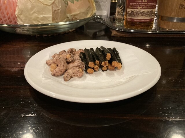 チャームの皮付きカシューナッツはそのまま食べられるとのこと、海苔巻きも海苔の質がよくて上品な風味と香りがするものでした。お会計は4杯飲んで9,900円でした。