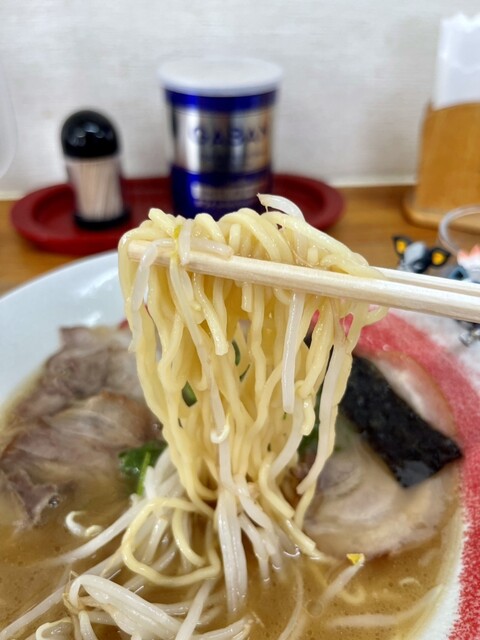 ややウェーブかかった卵不使用の中太のストレート麺で通常はやや柔らかめで提供されており(播州ラーメンの定番がやや柔らかめですが好みの固さに変更できます)ちょうどいいコシとパツッとした歯応えがある麺でスープをしっかりと絡んでくれてズルズルっと豪快に啜ることができます↕️✨