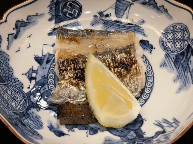 太刀魚は、太刀魚らしいさっくりした食感であり、かつしっとりした味わい。これもそのまま素材の味を生かすべく、うっすらとした塩味になっています。太刀魚の肝は幽庵焼きにして味変できるよう工夫もされている。