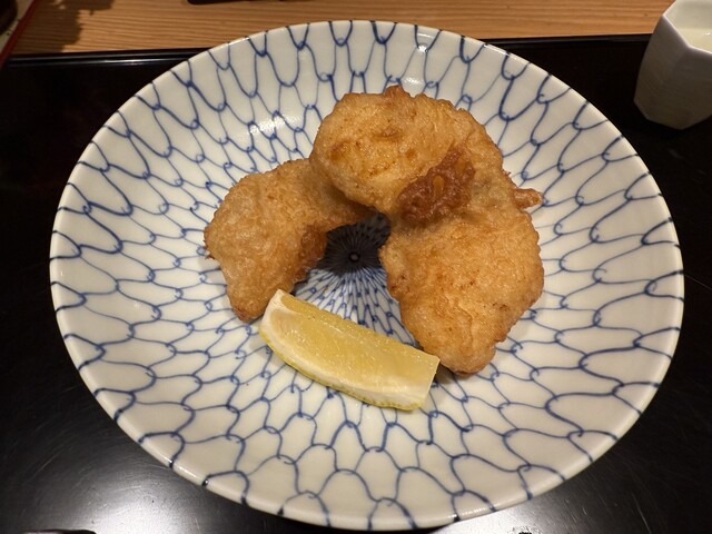 普通のフグの唐揚げと違って、衣の感じがフリットのような薄い膜を張ったかのような感じで、フグの旨みを逃さない工夫なのか。大きな身のフグで食べ応え十分でした。フグ皮は冷たい出汁が凝縮されたジュレが素晴らしい。
