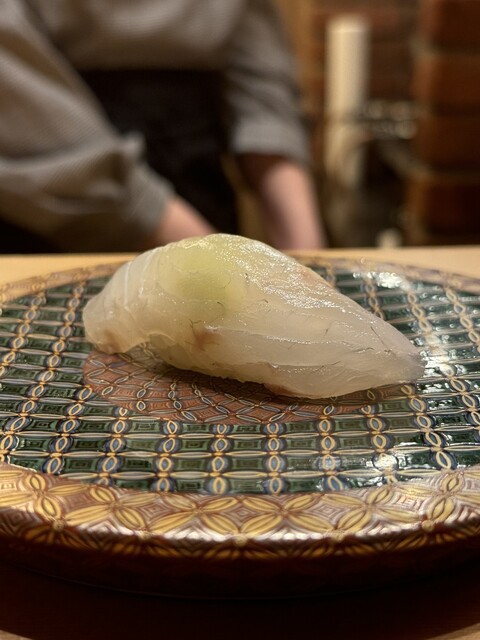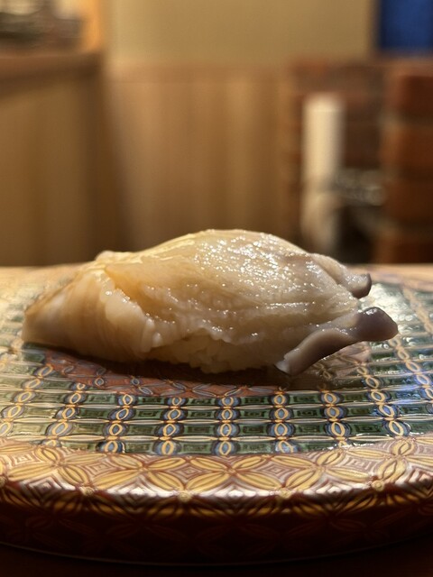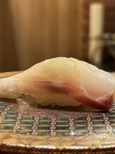五貫目は 石垣鯛。この時期は甲殻類ではなく海藻を食べているため、香りが良く味も清らか。まさに“旬”を感じる一貫で、春の海の澄んだ空気をそのまま味わうような清涼感のあるお寿司でした。皮目の処理も美しく、やさしくほぐれる身の繊細さが際立っていました。