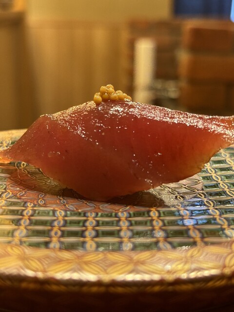 九貫目は カツオ。宮崎ならではの甘めの醤油で漬けられており、上には粒マスタードがちょこんと添えられていました。この意外な組み合わせが驚くほど調和していて、カツオの鉄っぽさが一切なく、香り高く、まるでタパスのようなニュアンスも。日本酒との相性も抜群でしたが、赤ワインにも合いそう…そんな新しい発見のある一貫でした。