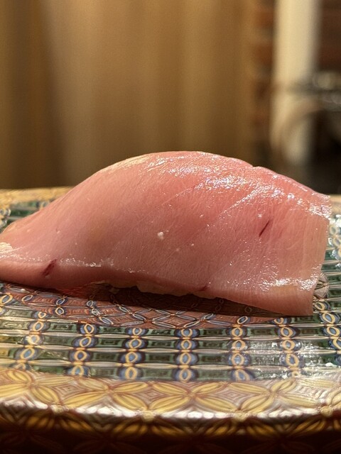四貫目は 壱岐のヨコワ中トロ。美しい艶を放つ赤身は、口に含んだ瞬間に脂がすっと溶けて、赤身の力強さと中トロのなめらかさが同居する極上の味わい。シャリとの一体感も素晴らしく、ほんのり温かいシャリがネタの旨みを引き立てていました。壱岐産というのも珍しく、産地にまでこだわる大将の姿勢が伝わります。