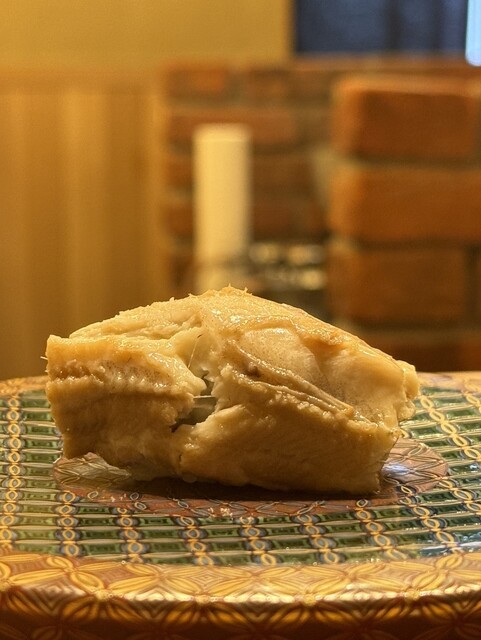続いては サワラ。こちらはスルメと昆布の松前漬けで漬けられているという、なんとも手間のかかった一貫。漬けられていることで生臭さは一切なく、旨味が何層にも重なって深い味わい。香りにスルメのニュアンスが加わり、噛み締めるたびに旨みがじゅわっと染み出してくる感覚。まさに“仕事をされた”お鮨の真髄を味わいました。