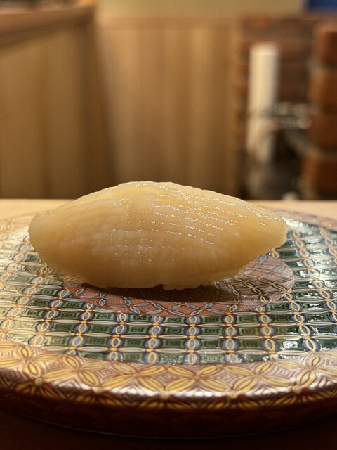 七貫目は 有明の平貝。見た目からして艶やかで、かすかな香ばしさとともに平貝特有の歯ごたえが楽しめました。とにかく繊細な甘みと、シャリとの一体感が素晴らしく、食感のコントラストが心地よい。大きさもちょうどよく、品のある存在感でした。