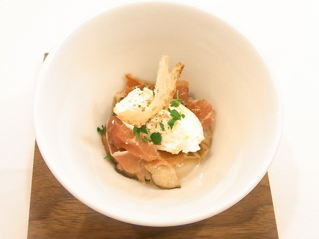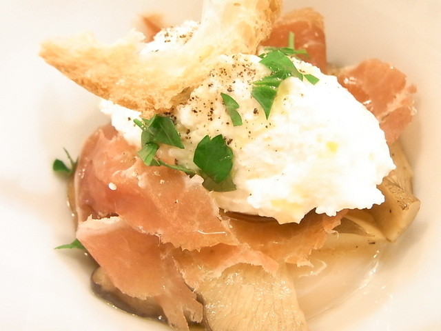 ◆つきだし 温度卵・生ハム・チーズのムース・各種キノコ