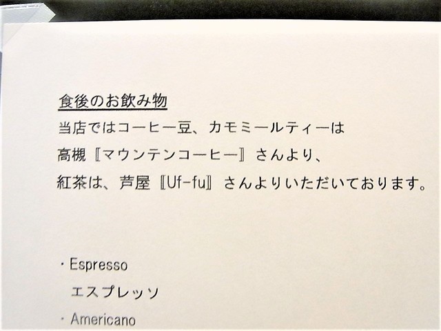 飲み物は、エスプレッソ、コーヒー、ストレートティー各種他。