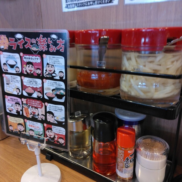 まずは胡椒と胡麻だけかけていただきますが、濃厚で味もさほど濃くはなく、ご飯に本当に合うなーという感じです。となりのおっさんは、ラーメン麺増しのライス大盛を食べていましたが、大盛も行けそうです。