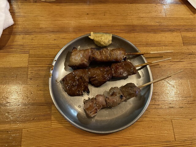 ちょい呑みセット500円(価格は全て税抜き)で、お好みドリンクと、おすすめ串3本が出てきますので、角ハイボールを選択。これはお得。串3本は何か忘れましたが、全部歯ごたえ、味、脂身があり美味しいです。おすすめはなんといってもレバテキ(190円)です。ふわっと焼いたレバーに、ネギごま油をたっぷりかけてくれます。