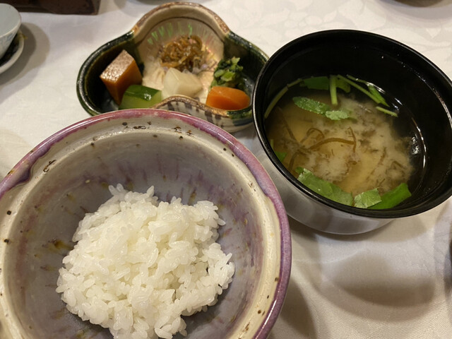 御食事 霧島産ひのひかり、香の物。留め椀 薩摩汁