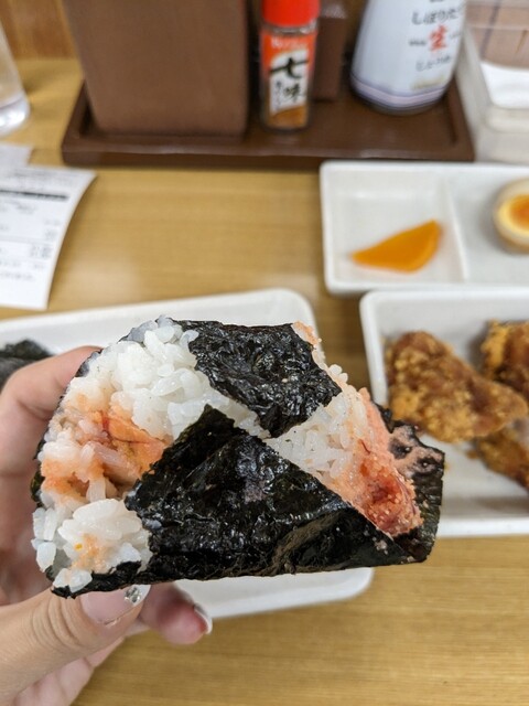 おにぎりについてくる唐揚げは外はカリカリ中はしっとりでびっくりする美味しさです。