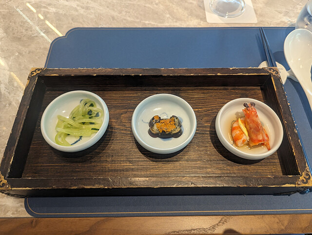 左から茎レタスのネギオイル掛け、上海蟹の黒酢煮こごり、才巻海老の麹漬け。どれも上品な味付けでこの後の料理にも期待が膨らむ内容。特に上海蟹の黒酢煮こごりは上海蟹の濃密な香りが楽しめる逸品。