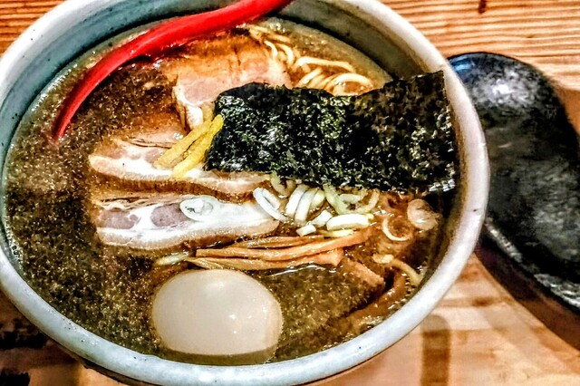 サンマ節をベースにした魚介系と、鶏ベースの動物系を合わせたダブルスープ。3種類の醤油をブレンドしたタレが、奥深いコクを生み出しています。麺はモチモチとした食感の太麺で、スープによく絡み、食べ応えのある一杯です。