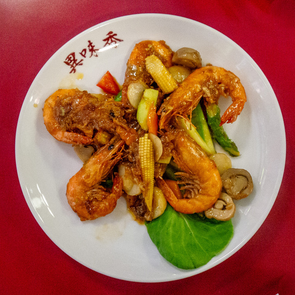 メインは「天使のエビのアスパラのXO醤」。 "天国に一番近い島”ニューカレドニアで養殖された世界最高級のエビ「天使のエビ」は、殻が薄く身が締まっているため、殻ごと食べることができます。天然の車エビを凌ぐアミノ酸の含有量だそうで、極上の旨みと甘みが口いっぱいに広がる逸品です。なお、XO醤の旨みはお楽しみのために少し残しておくのがポイントです。