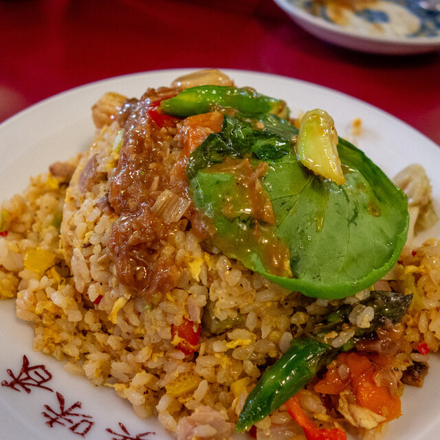 〆は「チャーシューガーリックチャーハン(レタス入り)」。 チャーシューとガーリックの香りが食欲をそそる極上のチャーハンですが、ここで先ほど残しておいた「天使のエビのXO醤」を混ぜると、まさに至高の逸品へと昇華します。この食べ方はぜひ試していただきたいです。