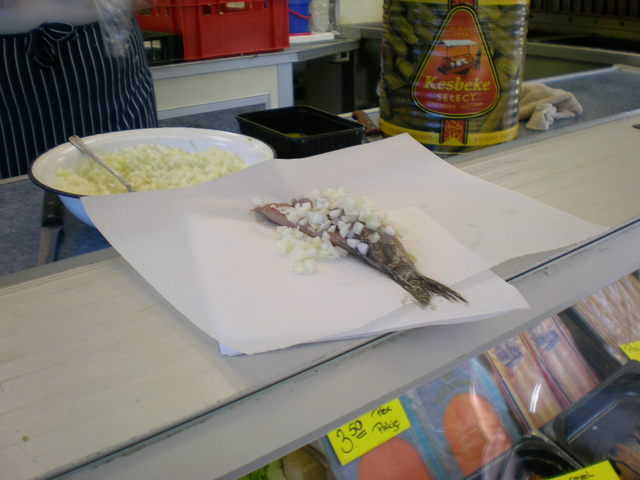 若いニシンの酢漬け。これにオニオンをたっぷり乗せます。