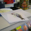 しっぽをつまみ持ち、その手を高く上げ、顔は上を向き大きく口を開いてパク。