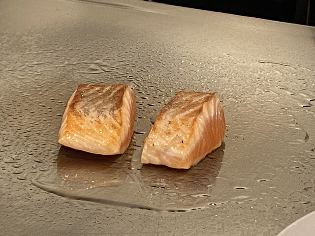 これらをいただきつつ目の前の鉄板ではホタテとサーモンが焼かれています。
