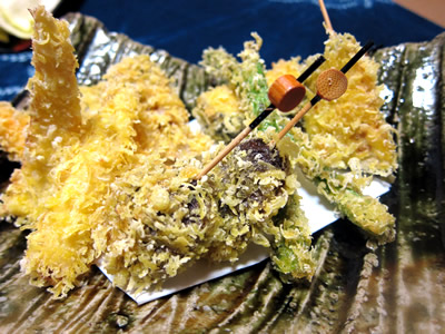茄子、ヤングコーン、椎茸、アスパラ、海老、などなど。