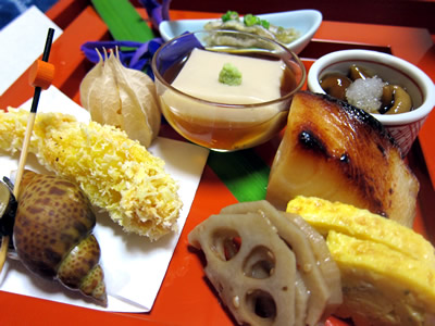 西京焼きや胡麻豆腐、海老の天ぷらなど。