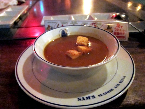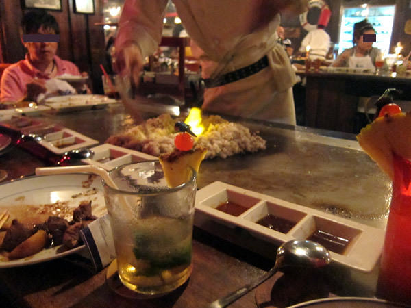 沖縄のステーキといったら、サムズアンカーイン!最初は何がなんだか分からないうちに連れてこられてきたお店ですが、今では沖縄に来るたびに「行きたい!」と思うようなお店です。そこまで観光地の飲食店という認知のされ方はされていないっぽいけど・・・。でも僕の中では、沖縄のアメリカンレストラン、そしてアメリカンステーキ。といったら、もうこのお店なのです。とにかく、沖縄でのいろんな思い出の集大成ともいえるお店。それくらいの圧倒的な存在感とコンテンツの「特別な」ステーキハウスなのです。■沖縄のステーキレストランチェーン・サムズグループhttp://www.sams-okinawa.jp/ancaor_inn/全く土地勘がないので、正直スクエアからこんなに近いと思いませんでした。滅茶苦茶近いじゃん!目印は、この縦に長い看板。入口はこんな感じ。日本人にはなかなか無い感じのエントランス。外国のホテルみたいですよね。お店は2階なので、ここから階段で上がります。階段はすごく広くて上がりやすいのですが、見ての通り名刺のトンネルになっています。なかなか年季の入った名刺もあり、時代を感じさせます。お店はわりとアッパークラス向けだと思うので、特別な日に食べにくると思うのですが。いち平社員の名刺が、やがて課長になり、支社長になり。お金持ちになって普通に食べにこられるようになる。そんなサクセスストーリーがありそうで、いろいろ感慨深い。ていうか、天井とかどうやって貼ったんだ!?もちろん僕も去年すでに名刺を貼ってありますよ、ふふん。ほら、この通路のド正面に目立つオレンジの名刺が、って、あ・・・た、たったの1年の間に、上書きされて貼られてる!株式会社〇〇〇〇〇〇の〇〇め~。会ったことないけど、妙な親しみを感じるぞ!と、いう風に妙なつながりのようなものがあって、なかなか面白いですね。あと、かろうじてロゴを外されているあたりに良心を感じる。入口に入ってすぐの、待合室。ここでテーブルが空くのを待ったり、友人たちが集まるまで待つロビーみたいな空間。こんなに広いところを用意しているなんて、男気を感じます。まずは席に着席。画像を補正しているので明るく見えますが、実際には隣の人の表情がかろうじて分かるくらいの暗さです。レストランでここまで暗いのって珍しいですよね。僕はノンアルコールのドリンクから選んだので、こんなの。フルーツとかが突き刺さって、いろいろ楽しいです。女性店員さんたちは、こんな感じのセーラー服・・・というより水兵さんの格好をしています。可愛い、と周りはいいますが、イマイチ僕には萌えポイントが分かりません・・・。あと明らかに「大きなお姉さん」的な年齢の人もいて、ぎりぎりです。あ、念のためですがミニスカートではなく、半ズボンとしか表現できないのをはいてます。セーラーズボン(ガリガスキンズ)ではないだけ、まだマシですね。通常のカクテルは、こういう特殊な容器に入って提供されるので、飲んでて楽しいです。ドリンクによって形状の異なる容器になっていて、食事後に持ち帰ることができます。これだけでも記念になりますね。このお店は、こんな感じにエンターテイメントとしてのサービスがあるのが特徴。まずはスープ!クルトン入れるところまで目の前でやってくれます。ちなみに年中通しでネイビービーンのスープみたい。なんでネイビービーン(白インゲン豆)かというと、この豆はアメリカ海軍の貯蔵食料で、アメリカ水兵さんが食べる豆の缶詰といったらネイビービーンとのことです。へぇ。低脂肪・食物繊維豊富な上に栄養たっぷりと、優れた食材だそうです。これはスープにするといいね!お次はサラダ。ドレッシングが4種類から選べます。あとブラックペッパーも「ストップ!」というまでゴリゴリしてもらえます。野菜を先に食べておくことで身体にもいいっぽいけど、後で大量のお肉がくるので、箸休めにとっておくのもいいかもです。「とろりチーズサクサク衣」というオリジナルメニューとのことなので、これも注文してみた。確かにサクサクで美味しい。ていうかチーズフライ系は普通に美味しいと思う。お酒のおつまみにいいですね。下から固形燃料が温めてくれてるので、チーズがとろとろで美味しいよ!まずは野菜を焼いてくれます。これは季節の野菜らしい。結構ボリュームがあります。あとポテトも。これだけで胃袋の半分くらいをもっていかれるので、気を付けたほうがいいです。そしてお肉がスタンバイ。何が入ってるか分からないハンバーグとは違い、切り出したお肉を目の前で調理してくれる。「鉄板焼き」という高級さの醍醐味は、調理前と途中の、この瞬間のためにあるといっても過言ではない。お肉の質感とか、目の前でジュージュー焼かれる匂いと音を堪能しましょう。これはナイフで遊んでいるわけではなく、調理パフォーマンスです。ナイフをくるんくるん回したり、ジャグリングみたいなことした