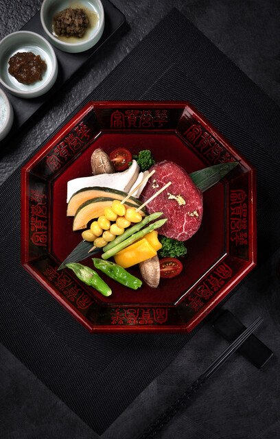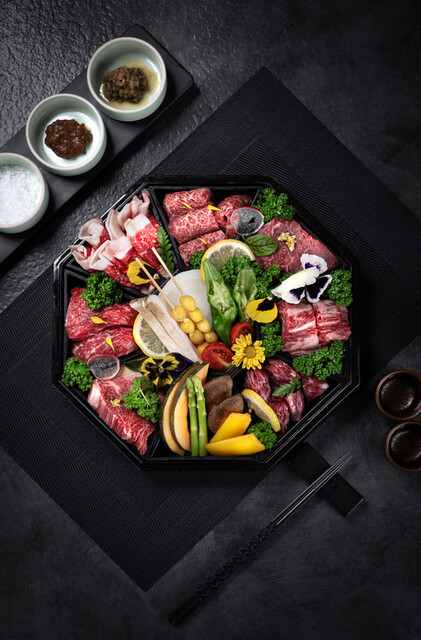 看板は1++ No.9 プレミアム韓牛盛り合わせ(600g)。サーロイン、ヒレ、リブアイキャップ、ザブトン、ハラミ、ブリスケットなどの6部位を一度に味わえ、部位ごとの香りや食感のコントラストがくっきり。その日の熟成状態に合わせてスタッフが最適な組み合わせをご案内してくれるので、まずは盛り合わせで食べ比べ、気に入った部位を追加するのがおすすめです。