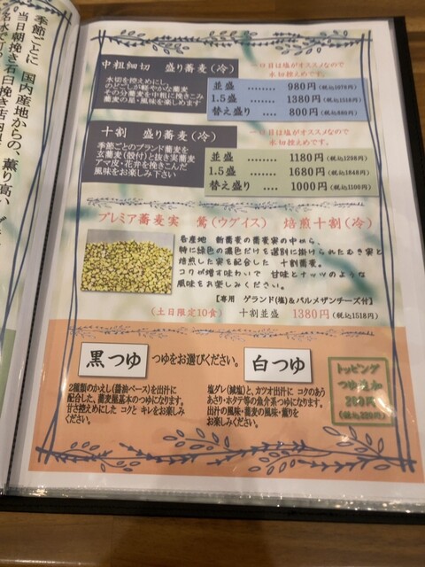 おつゆは2種類あり、黒つゆは一般的なもの、白つゆは塩だれ(減塩)とカツオだしにあさり・ホタテ等の魚介系とのこと。