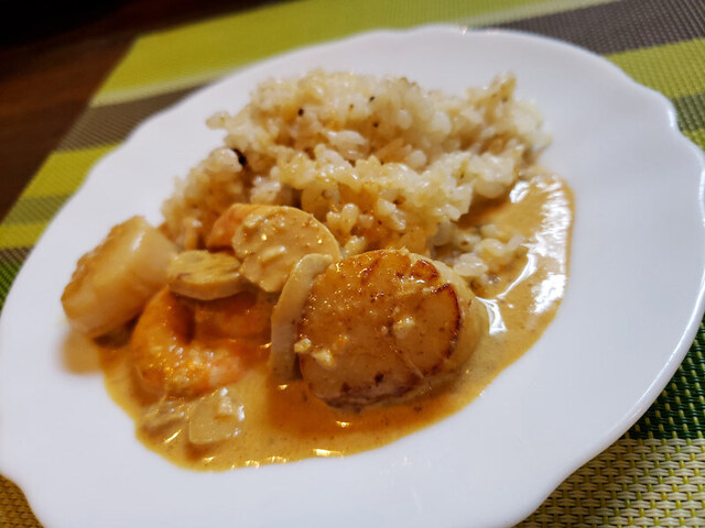 ホタテと小海老のニューバーグ風とバターライスですヽ(^。^)ノ
