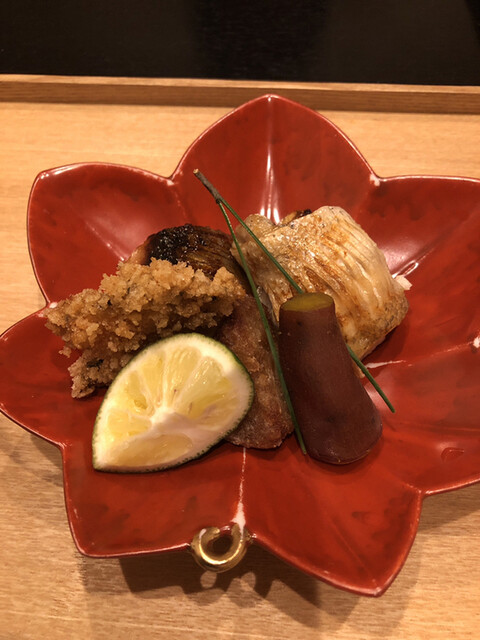 ・焼物 アワビの香煎揚げ、鰆の幽庵焼き