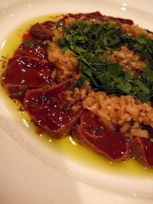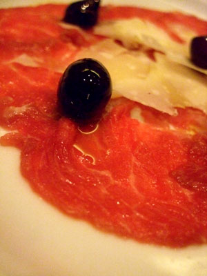 ○庄内産羽黒仔羊のカルパッチョ¥1,700(すっかり有名になった庄内の奥田政行シェフ「アル・ケッチァーノ」と同じ仔羊です。好きな羊のにおいがキレイになりすぎてちょっと拍子抜けも、貴重な生羊を初体験)