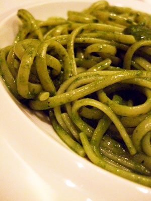 ○トゥレネッテのバジリコペースト和え¥1,800(スペシャリテ。バジルを大量に使った濃厚なペーストが抜群の絡みと粘り、最高に旨い!本当に大盛りをオーダーしたくなるですよ)