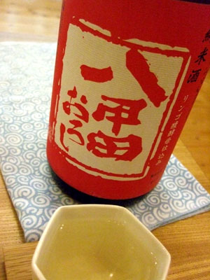 ご主人が厨房と日本酒の冷蔵庫を往復しながら、マリアージュを推奨してくれる。注目の1本目は、青森県十和田市の「八甲田おろし純米酒リンゴ酸酵母仕込み」。スターターとして、と薦められたのだが、爽快な口当たり、華やかなリンゴの香り。ブラインドなら白ワイン(もしくはシードル)としか思わないでしょう(すぐ欲しくなって買いました。twitterで触れまわったので何本か売れたんじゃないかな? ▽詳しくはこちら)。