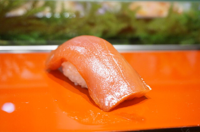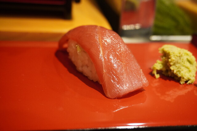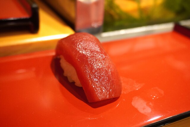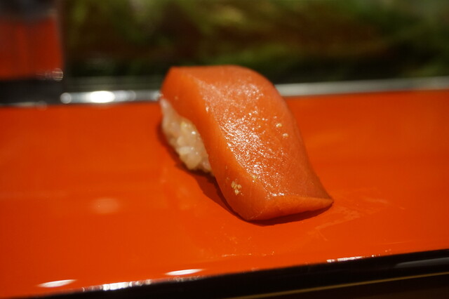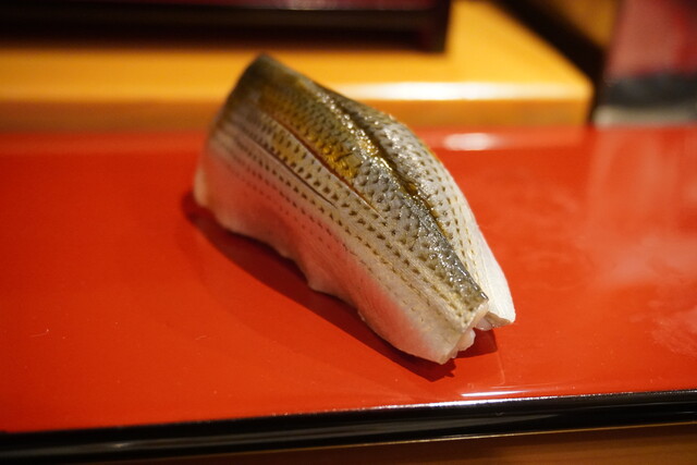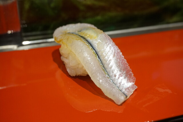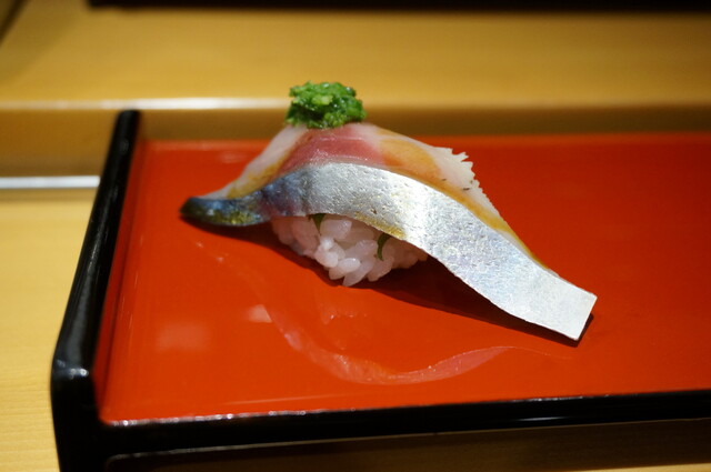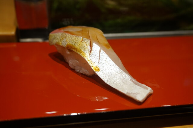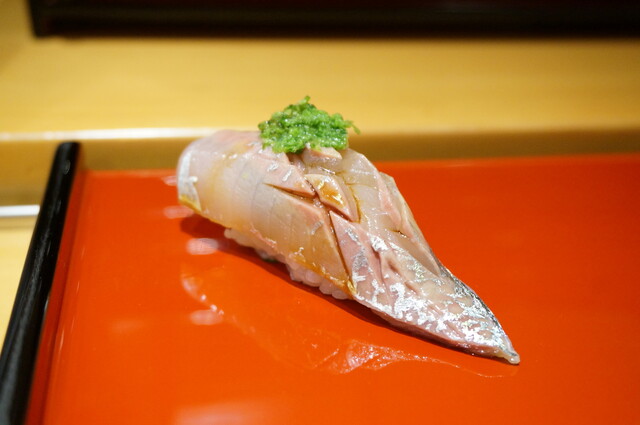 頃合いを見て握りに切り替えます。最初は赤身か鯵。この店は何でも旨いですが特に鯵は出足に最高です。