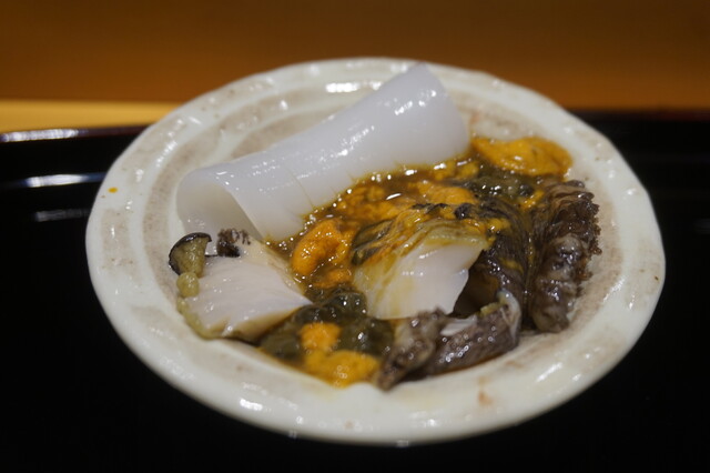 生の鮑は単なる刺身ではなく肝の雲丹和えに烏賊の刺身も付くウルトラ贅沢な一品。