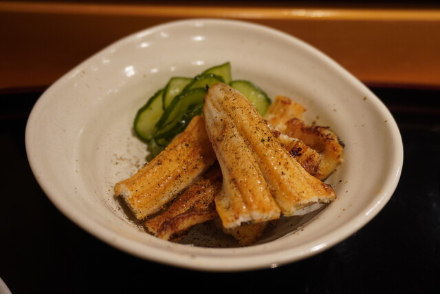 穴子はやや小ぶりで表面は水分が飛んでカリッと仕上がっています。そこに京都の一味と極薄スライスの塩もみ胡瓜。